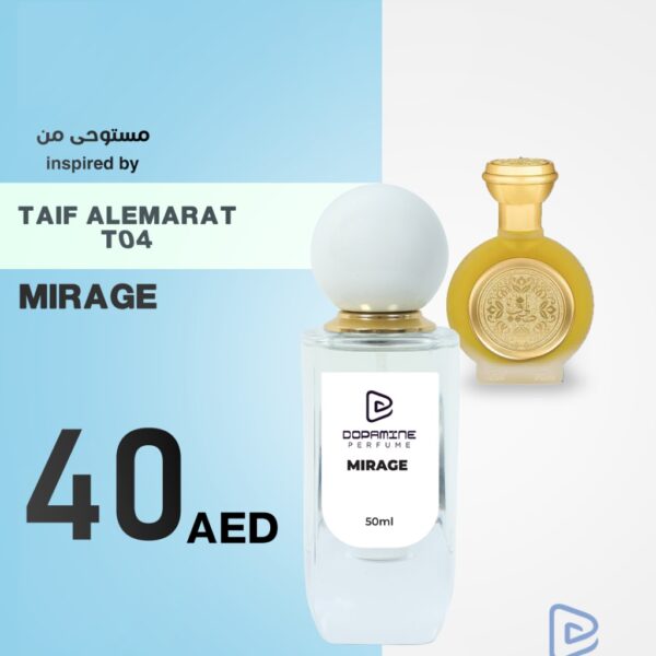 د.إ40Mirage by Dopamine – Where sweetness meets depth in a dream-like blend.Inspired by the elegance of Taif Al Emarat T04, Mirage opens with golden honey and rich oud, layered with the juicy allure of apricot and cherry. The base unfolds into a warm, sensual mix of patchouli, vanilla, and cocoa — creating a fragrance that's both bold and irresistibly smooth.